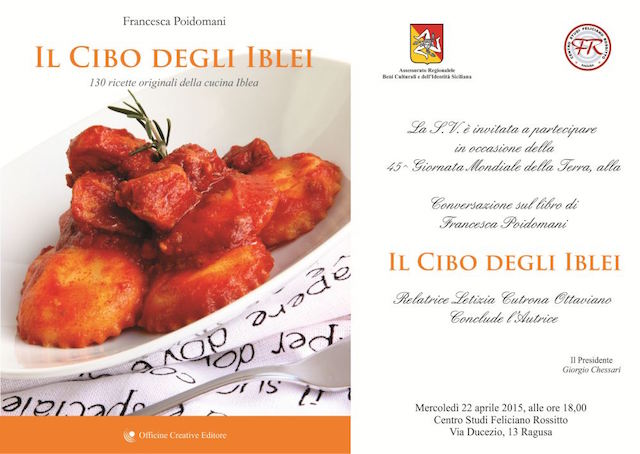 Ragusa, 17 aprile 2015 – Mercoledì 22 aprile 2015, alle ore 18, nei locali del Centro Studi “Feliciano Rossitto” (Via Ducezio 13 Ragusa), si terrà una conversazione sul libro di Francesca Poidomani, Il cibo degli Iblei - 130 ricette originali della cucina iblea, Officine Creative Editore.