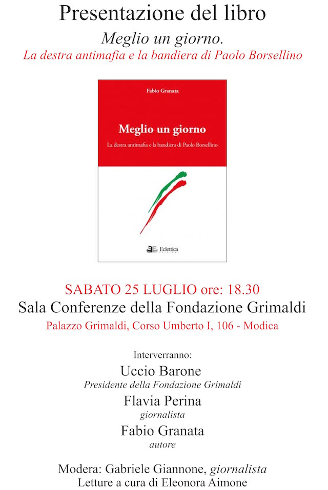 Modica, 23 luglio 2015 – La Fondazione Giovan Pietro Grimaldi è lieta di patrocinare ed ospitare le riflessioni e i ricordi disincantati all’origine e a margine di Meglio un Giorno. La destra antimafia e la bandiera di Paolo Borsellino, Eclettica Edizioni, terza pubblicazione di Fabio Granata.
