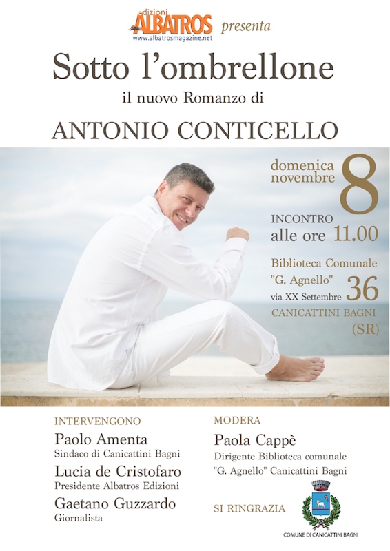 In quest’ambito, Domenica 8 Novembre alle ore 11:00 nei locali della Biblioteca comunale “G. Agnello” di via XX Settembre 36 a Canicattini Bagni, si presenta “Sotto l’ombrellone” (Edizioni Albatros pag. 126), l’ultimo romanzo di Antonio Conticello, 53nne architetto e “creativo” di origine palermitana, ma cresciuto ad Augusta dove muovere i primi passi nelle radio e tv locali, prima di trasferirsi negli anni ’90 a Milano.
