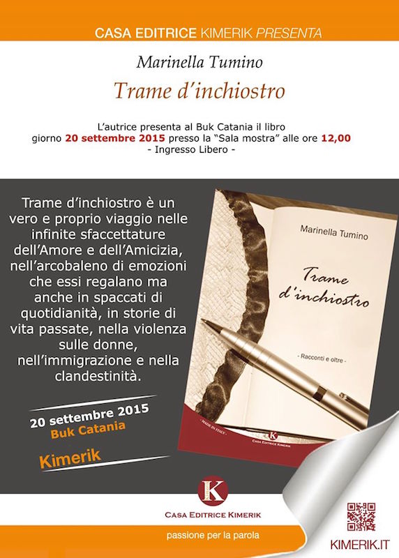 Avendo letto la bellissima introduzione di Giovannella Galliano al libro Trame d’inchiostro (racconti e oltre) di Marinella Tumino (Kimerik edizioni), stavo pensando di non aggiungere altro perché condivido quanto la giornalista scrive, ma penso che valga la pena sommare sensazioni a sensazioni e consigliare la lettura del libro per vari motivi.