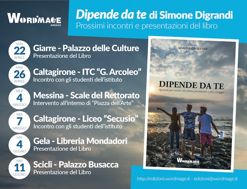 Ragusa, 22 aprile 2016 – Inizia da oggi, a Giarre, un nuovo ciclo di incontri per presentare il libro “Dipende da te” del giovane trentenne ibleo Simone Digrandi, e la sua testimonianza di giovane che, negli anni della crisi, ha cercato di aprirsi una strada sul piano lavorativo e quello dell'impegno civico.
