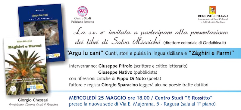Mercoledì 25 maggio, alle ore 18 presso i nuovi locali del Centro Studi “F. Rossitto” (Via E. Majorana, 5 - Ragusa), si terrà la presentazione di “Argu lu cani. Cunti, stori e puisia in lingua siciliana” e “Zàghiri e Parmi”, di Salvo Micciché (direttore editoriale di Ondaiblea.it).