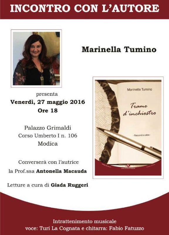 Il prossimo 27 maggio, presso il settecentesco Palazzo Grimaldi a Modica, l’autrice Marinella Tumino presenterà l’opera Trame D’inchiostro