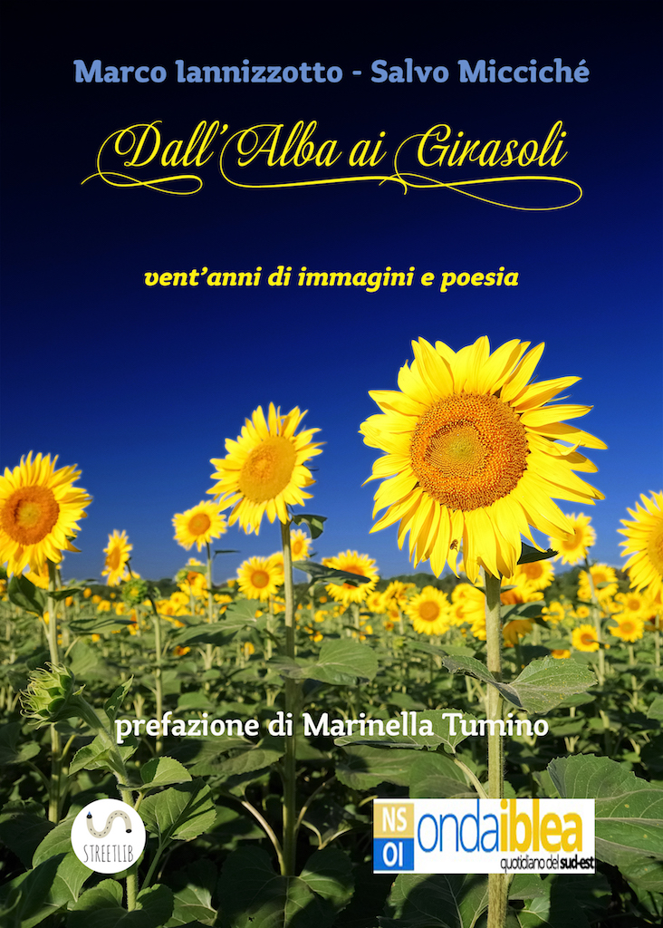È un’immagine di copertina particolare ed emblematica quella scelta da Marco Iannizzotto (avvocato e “cinefilo a 360 gradi”) coautore, insieme a Salvo Micciché (consulente informatico e direttore editoriale del quotidiano on line Ondaiblea), della raccolta poetica “Dall’Alba ai Girasoli” (Biancavela – StreetLib, 2016, pp. 84), in formato anche e-book. La parte iconografica (i girasoli) è molto luminosa e richiama in mente non solo la serie di dipinti ad olio su tela realizzati tra il 1888 e il 1889 da van Gogh, ma anche il suo significato più intrinseco. Un’infiorescenza giallo cadmio va ad animare, caricandosi di un valore simbolico, metafora della vitalità della natura, l’immagine stessa rendendola vivace e gioiosa e solida come l’amicizia di lunga data che lega i due autori.