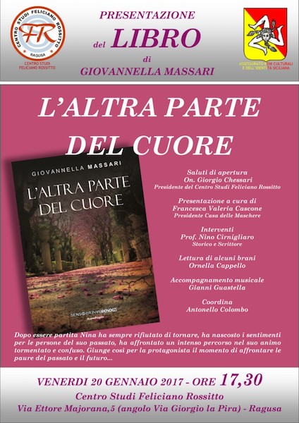 Ragusa, 13 gennaio 2017 – Venerdì 20 gennaio 2017 alle ore 17:30 nella sala primo piano del Centro Studi Feliciano Rossitto - Via Ettore Majorana, 5 – Ragusa, Francesca Valeria Cascone (Presidente Casa delle Maschere) presenterà il libro di Giovannella Massari, “L’altra parte del cuore”.