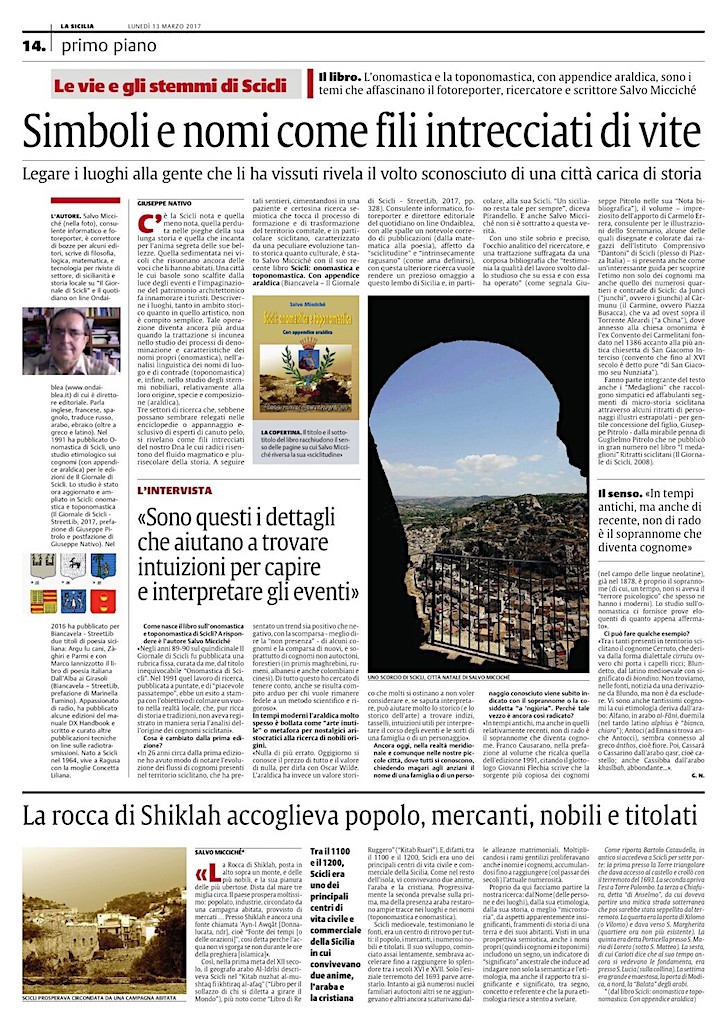 Simboli e nomi come fili intrecciati di vita: è il titolo della pagina che (a cura di Giuseppe Nativo) il quotidiano La Sicilia (edizione di Ragusa, 13 marzo 2017, pag. 14) ha dedicato al nuovo libro di Salvo Micciché, Scicli: onomastica e toponomastica, Biancavela - Il Giornale di Scicli - StreetLib, 2017.