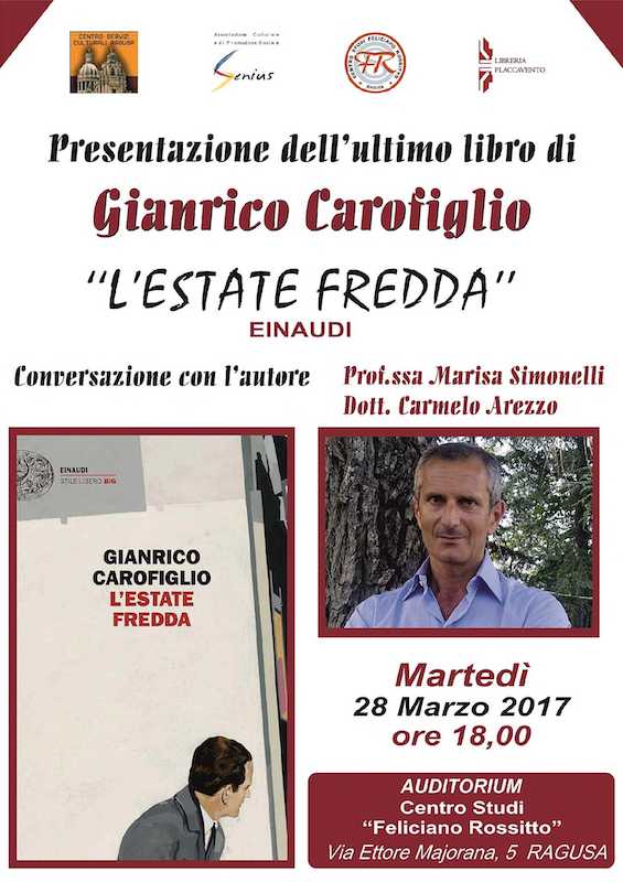 Ragusa, 16 marzo 2017 – Martedì 28 marzo alle ore 18 presso l’Auditorium del Centro Studi “Feliciano Rossitto” (Via Ettore Majorana, 5 – Ragusa) sarà presentato il libro di Gianrico Carofiglio, “L’estate fredda” (Einaudi, pp. 352).