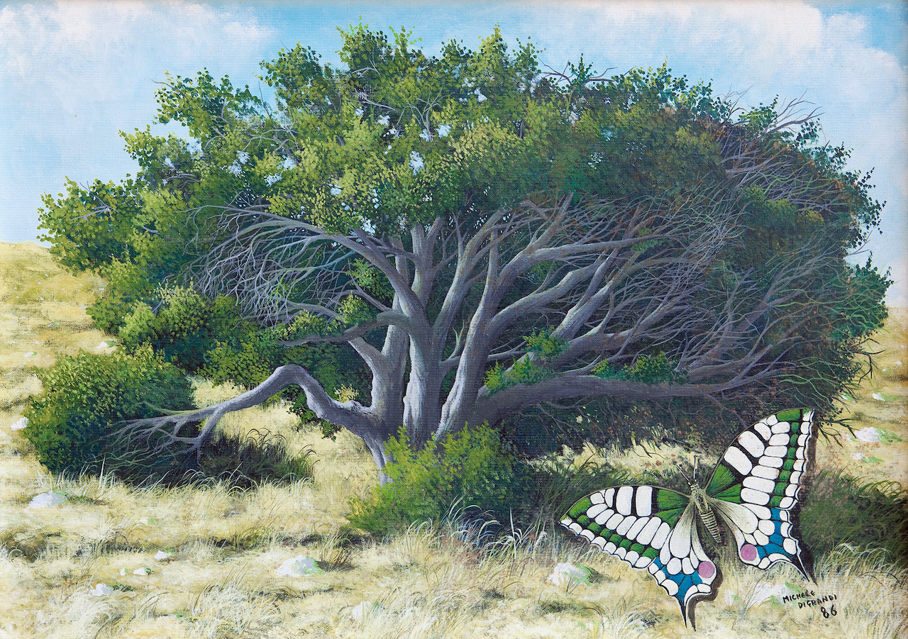 Sembra, infatti, di stare immersi nel sereno silenzio dell’arsa campagna, distratti solo dalla presenza di una variopinta farfalla, mentre un cielo turchino, incoronato da candidi batuffoli di nube, penetra tra le innumerevoli foglioline dell’albero. Colpiscono lo sguardo le variazioni di verde delle fronde, fino a quelle degradanti sul suolo, per il naturale passaggio dalla tonalità più scura a quella più chiara, come per ribadire la lucente carezza dei raggi solari e per confermare quell’effetto di plasticità e quel senso di movimento che solo un abile e veloce tocco di pennello può evocare. La splendida raffigurazione della farfalla, che appare simile a un ricamo prezioso, riempito dai colori bianco, verde, azzurro e fucsia, non ispira, nel fruitore dell’opera, l’idea di un volo reale nello spazio fisico occupato, bensì quella di un emblema interiore, di un sigillo peculiare dell’artista che, in tale insetto alato, si riconosce e si specchia, come simbolo di