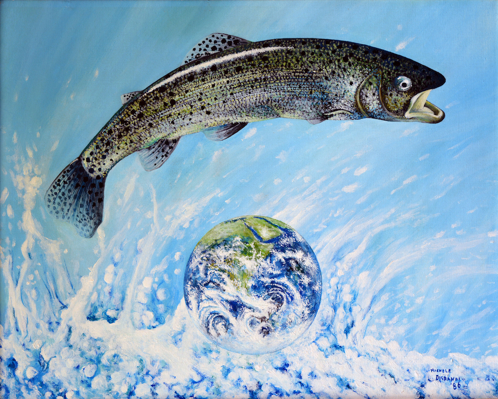 Le sensazioni fisiche, (visiva e uditiva) che accompagnano il fruitore del quadro, innescano riflessioni e pensieri sull’umano destino e sulla futura sopravvivenza degli esseri vegetali e animali nel loro territorio. Mentre la trota urlante, con il suo guizzo, simboleggia il tentativo di evasione da parte dell’umanità intera verso un habitat vivibile, quel volo illusorio della nostra terra, in un luogo pulito ma, purtroppo, utopistico, fa trasparire e, nel contempo, rafforza il generale sentimento negativo di impotenza e di sfiducia nei confronti delle insufficienti azioni avviate dalla politica mondiale a difesa di un ambiente gravemente sfregiato.