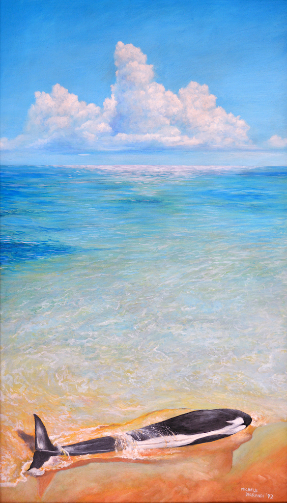 Il pittore ragusano, nel suo quadro intitolato “Morte annunciata”, denuncia la problematica ambientale relativa alla incessante moria dei pesci ed, in particolare, dei cetacei (qui una balenottera realmente arenatasi alla foce dell’Irminio) causata da sostanze tossiche disciolte in acqua e da micro o macroplastiche ingurgitate al posto del cibo. Ancora una volta, egli affronta il tema dell’inquinamento utilizzando, con evidente abilità tecnica, tutti i mezzi espressivi dell’arte, vivificati e plasmati dall’energia delle sue dirompenti emozioni. Il suo ansito di uomo sembra concretizzarsi nella maestosa nuvola antropomorfa che, con impotente rammarico, osserva la morte del piccolo cetaceo. La sua passione di artista si sprigiona e si libera nelle pennellate dal caldo colore arancio, che ricreano il mortale giaciglio, mentre, nel sottostante fondale, la tonalità cromatica rossa, in forte contrasto con gli azzurri sfumati delle acque vicine all’orizzonte, serve a sottolineare la presenza di una ferita aperta nella coscienza di ogni cittadino che, come lui, è sensibilmente preoccupato per questa incombente minaccia alla fauna ittica.