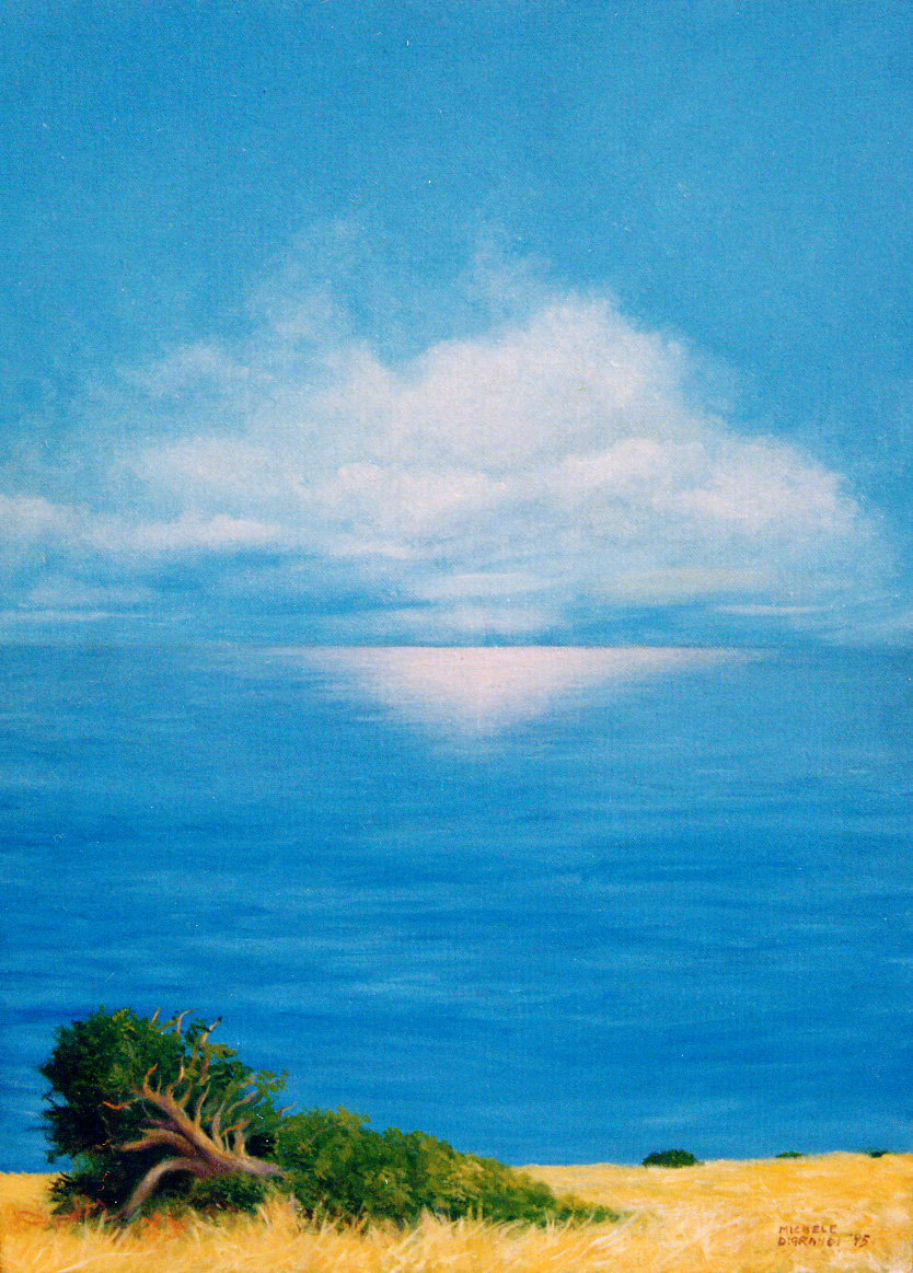 Una candida luce, filtrata da una vasta nuvola bianca, si presenta sul lontano orizzonte, ove il mare si confonde con il cielo in un amplesso turchino.
