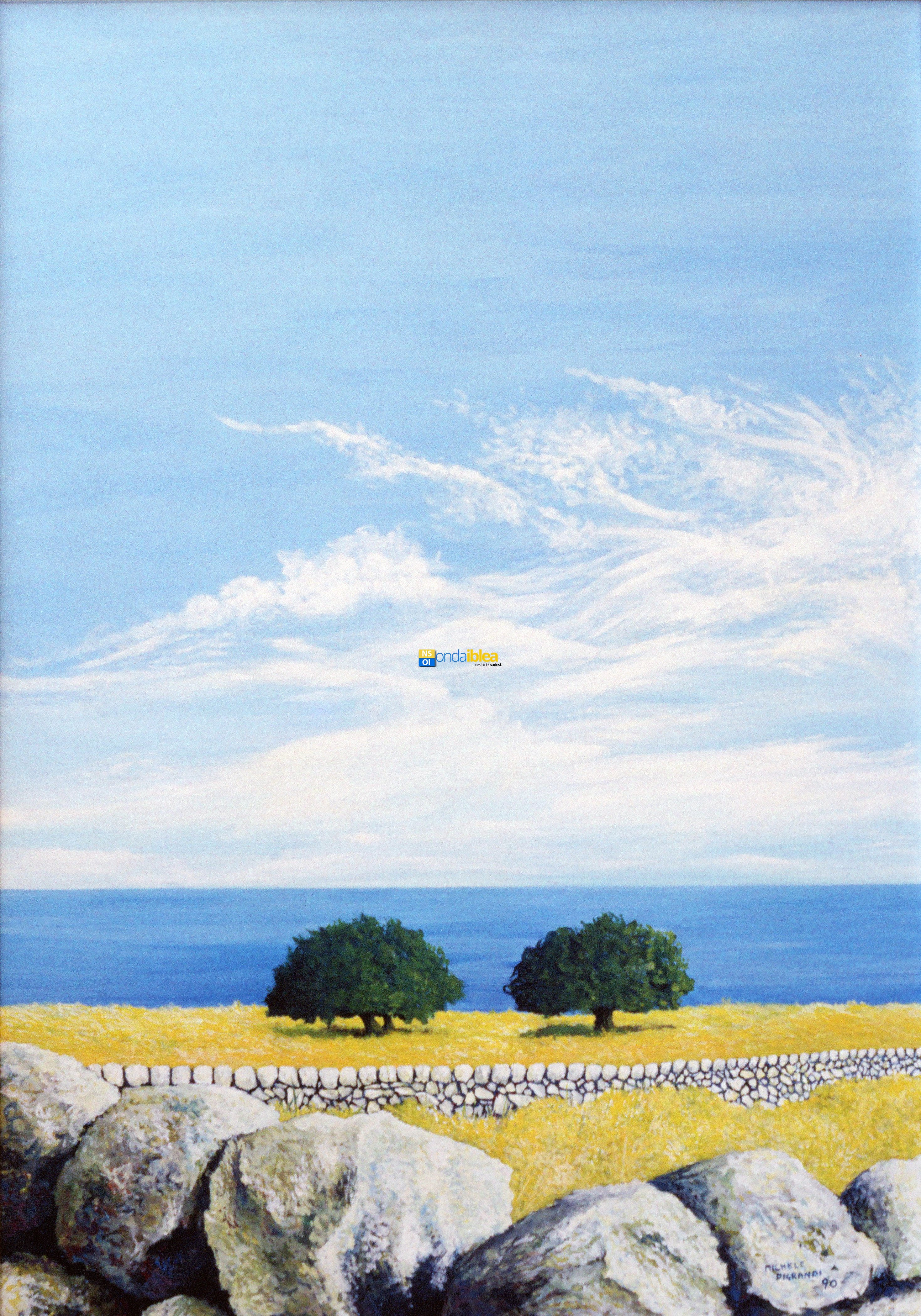 Ora, ciò che colpisce nei quadri di Michele Digrandi non è soltanto la loro luce di una irresistibile intensità, ma anche la loro immersione in una solitudine carica di oscurità. Si direbbe che l’artista, camminando per le campagne iblee in chiari pomeriggi d’inverno o nella quiete dell’estate, abbia scoperto che quel paesaggio, nella sua spettacolare autonomia dall’uomo e dalla sua storia, sia qualcosa di inquietante. Ma è soltanto un presentimento, una percezione dell’anima che Michele Digrandi adombra nei simboli e soprattutto in quei muri caratteristici della campagna iblea che tagliano lo spazio dei quadri in una prospettiva straniata. E tuttavia, il “paesaggio” di Michele Digrandi, nonostante l’inquietudine sottile che lo pervade, resta indimenticabile proprio per il suo sembrare facile, naturale. Ciò accade perché l’arte, per essere tale, deve in qualche modo ingannare: solo le immagini che sembrano ottenute con facilità riescono a convincerci che la bellezza è un fatto comune, dunque una realtà che nemmeno i nostri peggiori comportamenti e le nostre ansie più corrosive possono intaccare o nascondere. Mario Luzi, al quale in una fortuita occasione avevo mostrato alcuni lavori di Michele Digrandi, mi confermò che la pittura di quest’artista gli sembrava “matura ed equilibrata per la sua capacità di fondere insieme una verve fantastica ad un sottile lavorìo sulla realtà e inoltre riscontrava una rara musicalità del segno e del colore”.