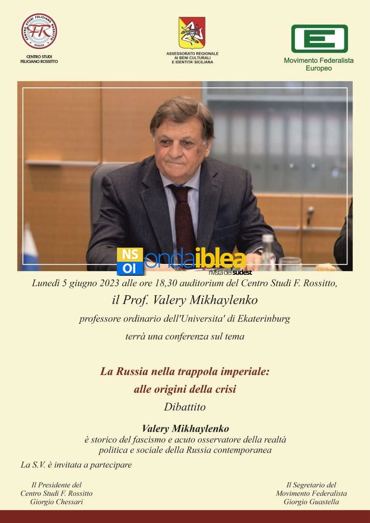 Ragusa, 30 maggio 2023 — Lunedì 5 giugno 2023, alle ore 18.30, presso l’auditorium del Centro Studi Feliciano Rossitto (Via Ettore Majorana 5, Ragusa), il prof. Valery Mikhaylenko (dell’Università di Ekaterinburg) terrà una conferenza sul tema: «La Russia nella trappola imperiale: alle origini della crisi».