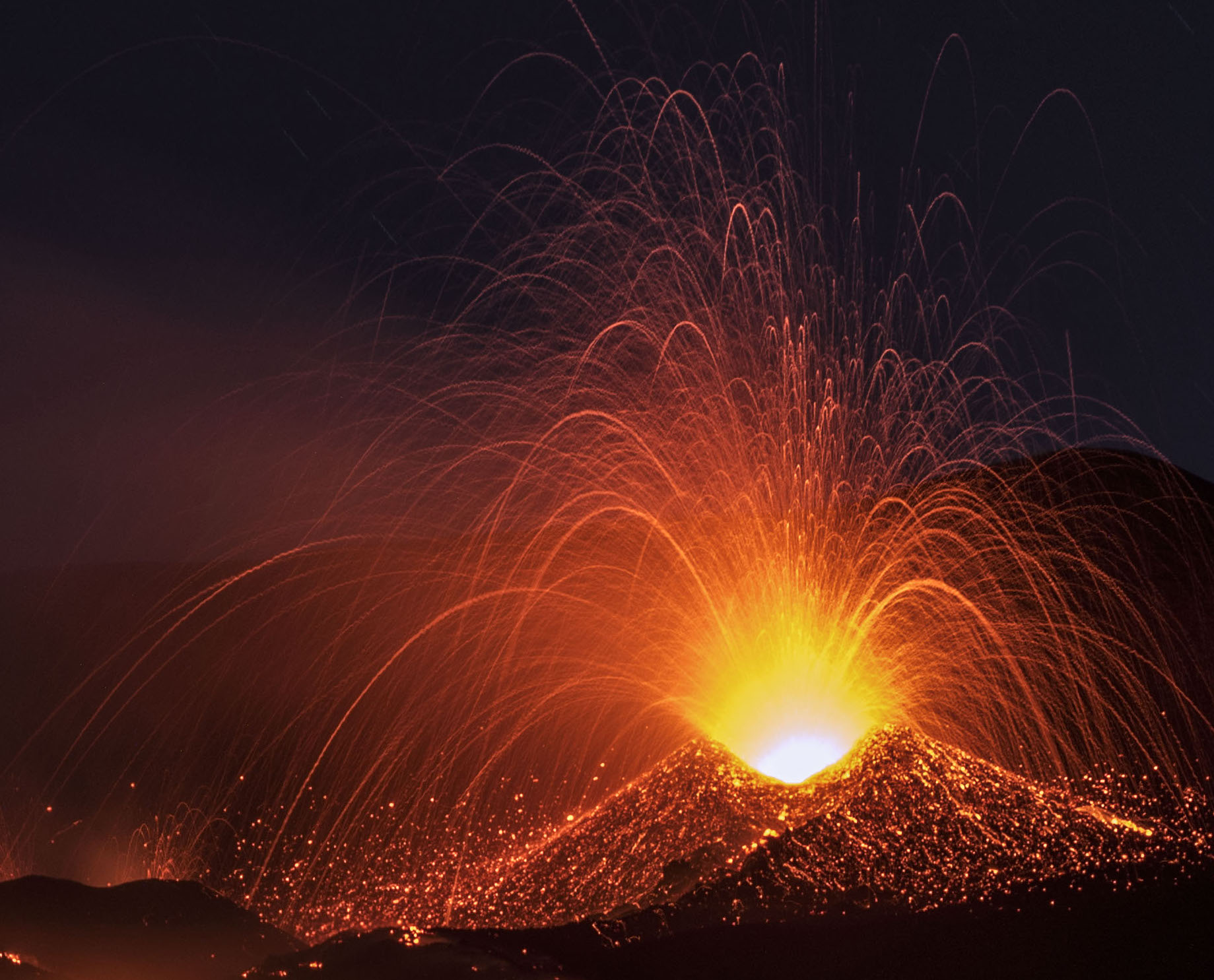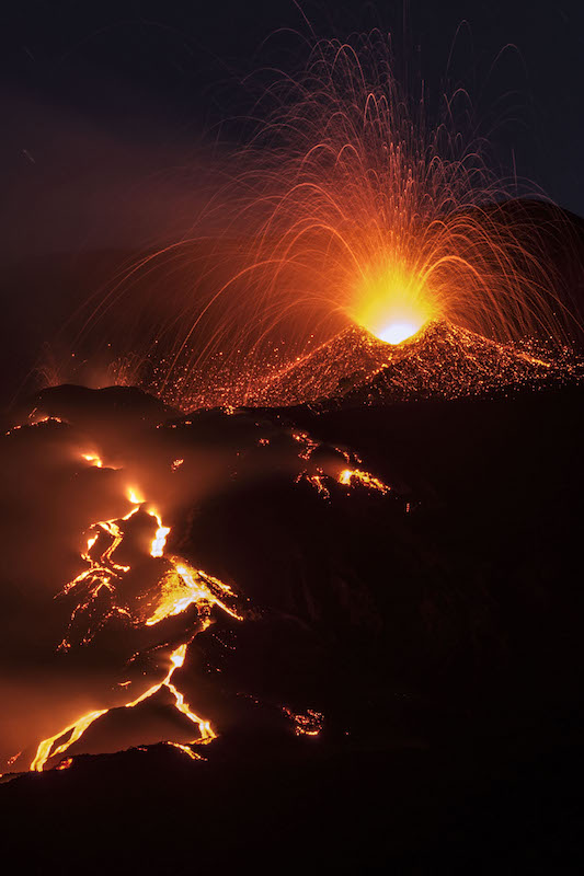 Quattro le sezioni della mostra: la prima racconta l'Etna da una prospettiva inedita e affascinante, con immagini aeree ma anche foto scattate alle prime luci dell’alba, quando l’ombra del vulcano si estende sui paesi limitrofi; la seconda e la terza documentano le spettacolari eruzioni diurne e notturne, con nubi dense di fumo e cenere che volteggiano nel cielo; la quarta mostra la suggestione straordinaria del vulcano di notte, quando le sue nuvole rosse si stagliano su cieli limpidi e stellati.