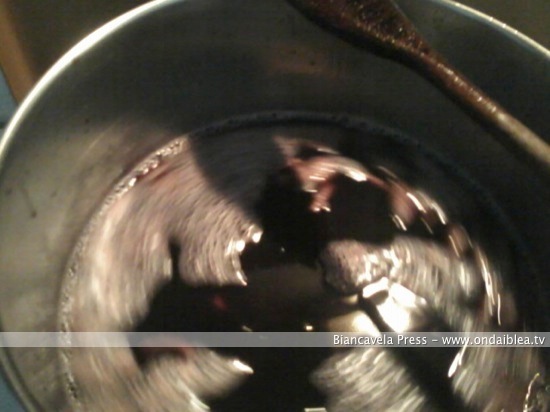 In una pentola versate i 5 litri di mosto fino ad ebollizione. Spegnete il fuoco e fate raffreddare. Mettete nel mosto la pietra morta precedentemente pestata; questa servirà per renderlo più dolce. Dopo di che lasciatelo a riposo per 24 h e il giorno dopo potete procedere a filtrarlo.