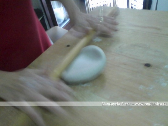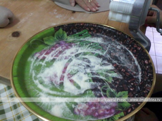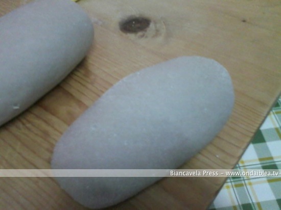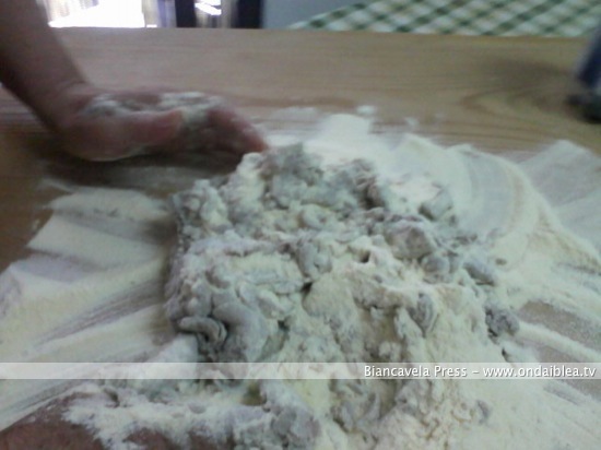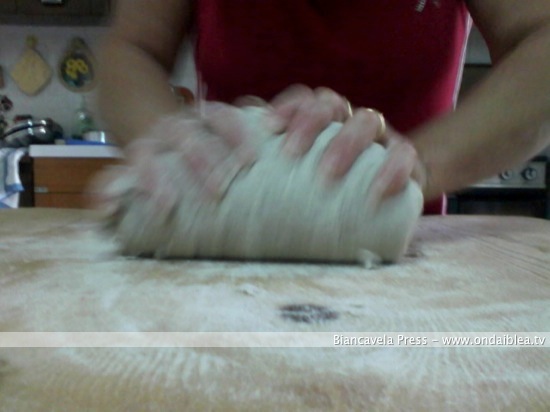 Procedete con l’impasto de i “Cuddureddi” con farina e mosto. L’impasto deve essere un pochettino duro in modo da poter poi dare la tipica forma alla pasta.