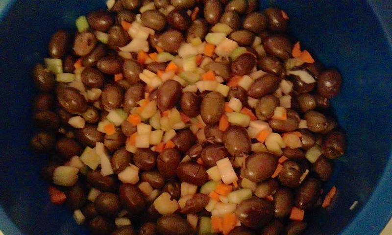 Dopo che le olive hanno colato l’acqua, mettetele in una bacinella e aggiungete abbondante sale, sedano e carota precedentemente tagliati a quadrettini e aceto bianco.