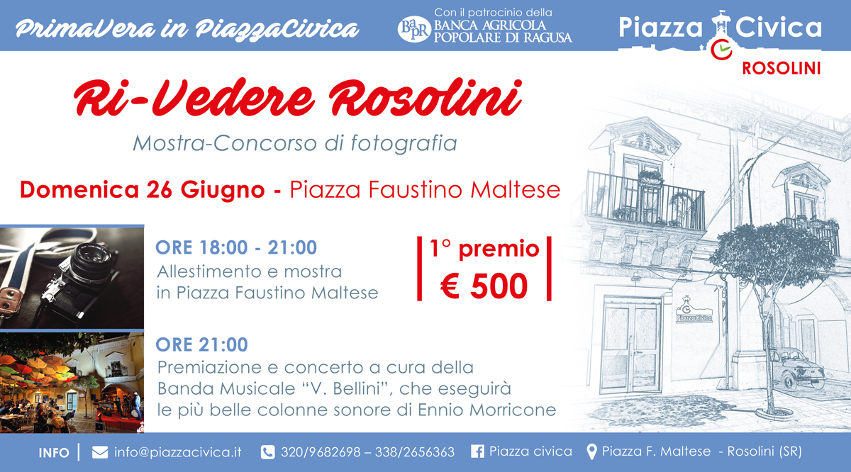 Rosolini, 15 giugno 2016 – Ri-Vedere Rosolini, è questo lo scopo della Mostra- Concorso di fotografia organizzata dal movimento politico- culturale Piazza Civica che chiude la fortunata manifestazione PrimaVera in Piazza Civica, una serie di quattro appuntamenti che hanno inteso animare il centro storico come segnale di speranza contro il graduale svuotamento residenziale e la crisi sociale ed economica attuale che ha colpito la città.