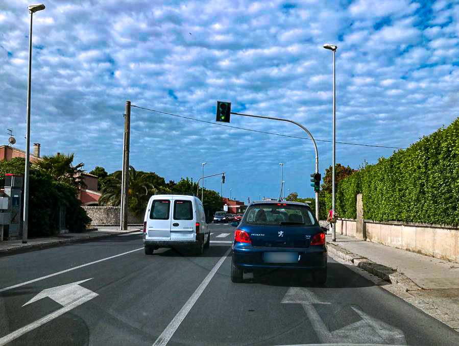 Ovviamente, appena scattato il verde, il furbo alla guida del pulmino è andato dritto, sorpassando il primo incolonnato (che era, per pura fortuna del furgonato, un ritardato), il secondo (l’auto blu davanti me) e proseguendo verso sud.