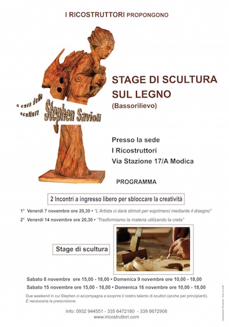 Modica, 30 ottobre 2014 – I Ricostruttori propongono uno stage di scultura su legno (bassorilievo) tenuto dallo scultore Stephen Savioli che si svolgerà in due weekend l'8 e 9 novembre e il 15 e 16 novembre con orario dalle 15.00 alle 18.00 il sabato e dalle 10.00 alle 18.00 alla domenica, adatto anche per principianti - necessaria prenotazione .