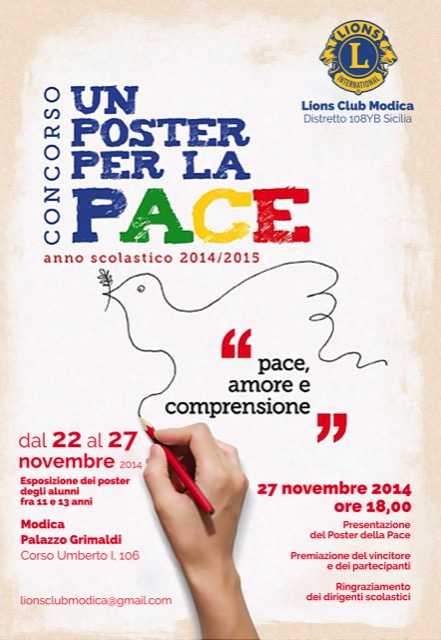 I partecipanti alla selezione locale che riguarda i comuni di Ispica, Modica e Pozzallo sono stati 54 e saranno 450.000 le opere, provenienti da tutto il mondo che partecipano all’edizione 2014/2015 del concorso de Lions International “Un Poster per la Pace”. Lions Clubs International sponsorizza il concorso per sensibilizzare i giovani fra 11 e 13 anni di tutto il mondo all'importanza della pace fra i popoli. Federica Di Gregorio e altri 53 studenti riceveranno un riconoscimento per la loro partecipazione al concorso sponsorizzato dal Lions Club Modica il 27 novembre 2014 alle 18,00 Palazzo Grimaldi in Corso Umberto,106 a Modica.