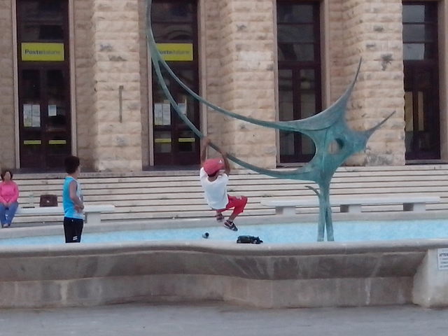 La mancanza di consapevolezza dell’importanza di una scultura, che non è solo la statua del delfino del maestro Cappello nella fontana di piazza Matteotti assaltata come si mostra nella foto, ma che può essere una volta il portone della cattedrale di San Giovanni o “L’isola spaziale” del maestro Di Pasquale in piazza Malta a Marina per fare degli esempi, è un male che può essere sanato solo con l’educazione all’arte. Arte che non è solo il barocco inteso come i mascheroni o la cupola di San Giorgio a Ibla, ma arte nel suo complesso e nella sue sfumature più varie.