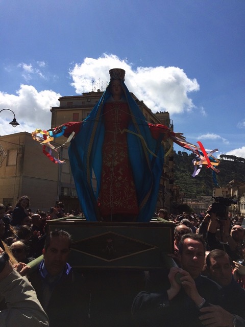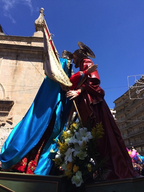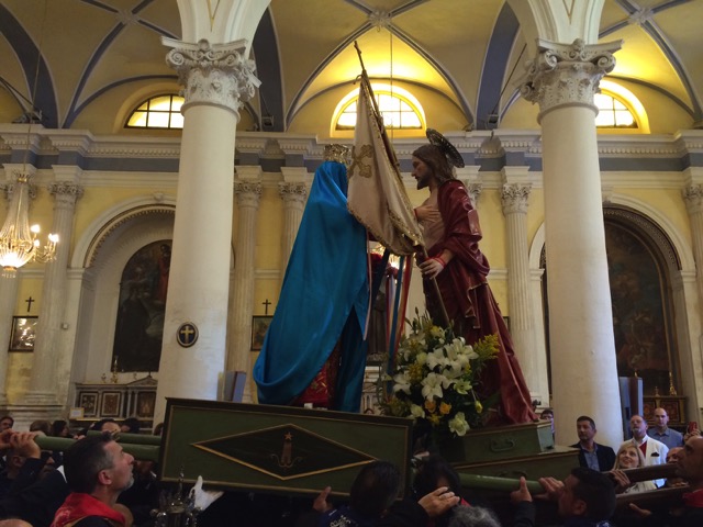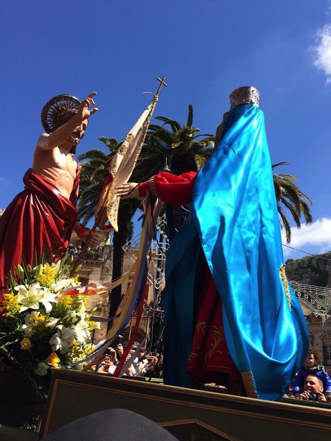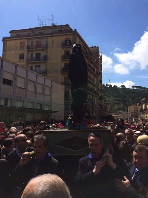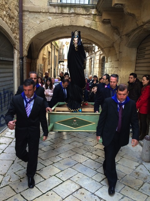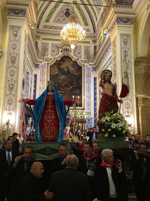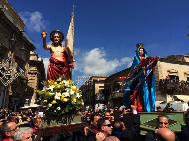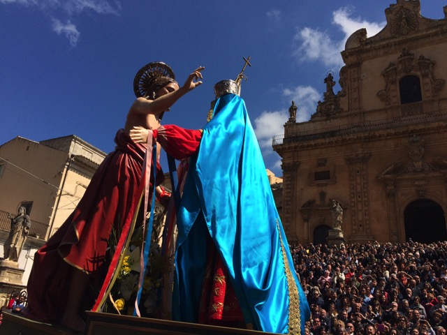 Modica, 5 aprile 2015 – La madre affranta incontra il figlio, e incredula lo ritrova Risorto: è la Madonna vasa-vasa, a mezzogiorno, e lo incontra in piazza Monumento, di fronte al Municipio, tra una folla immensa.