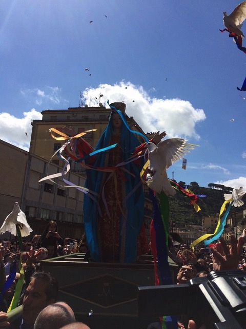 Agita le mani per segnalare la sua grande gioia. In piazza, tra una moltitudine di persone, esplode la festa. Mentre i mortaretti e il lancio delle colombe segnalano lo stato d’animo della Madonna. I due simulacri, a questo punto, si fanno spazio tra la gente e s’incontrano sino a dare vita al cosiddetto bacio, con la Madonna che quasi accarezza le ferite del figlio. Poi, entrambi i simulacri si rivolgono alla folla. E grazie al movimento meccanico delle mani, la Madonna benedice il popolo.