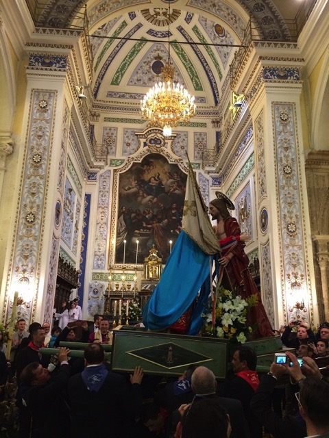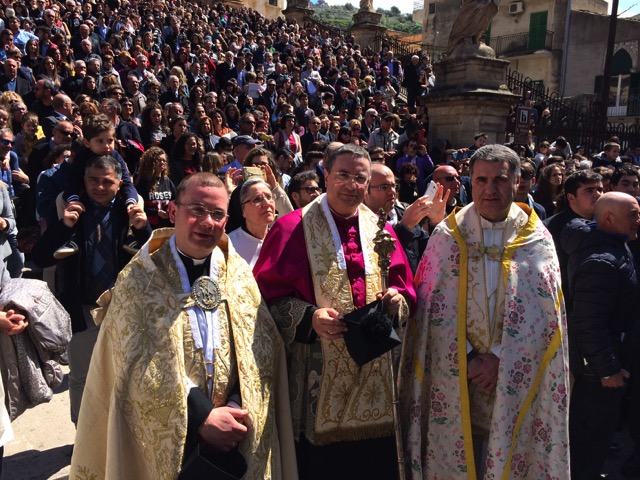 La processione, guidata dal parroco di Santa Maria di Betlem, don Antonio Maria Forgione, alla presenza del sindaco Ignazio Abbate e degli altri rappresentanti della Giunta municipale, e con le suore missionarie carmelitane di Santa Teresa del Bambin Gesù, si è mossa, quindi, verso la chiesa madre di San Pietro. Anche qui, alla presenza di moltissime persone sulle scalinate, è stato animato il rito del bacio, il secondo della serie, alla presenza dell’arciprete parroco di San Pietro, don Corrado Lorefice. Il terzo bacio dinanzi alla chiesa di Santa Maria di Betlem, prima che i due simulacri rientrassero in chiesa.