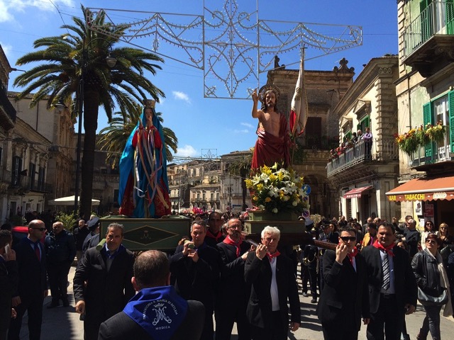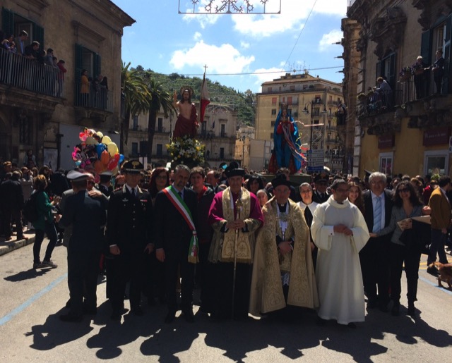 Qui, i portatori della Madonna, guidati da Mario Cappello, che gestisce la preparazione del simulacro con il manto nero da ben 30 anni, e che è coadiuvato dai figli Gaetano e Pietro, si sono adoperati per predisporre il momento dell’incontro. Dopo l’uscita dal Carmine, mentre nel frattempo la processione con il Cristo Risorto, animata dalla civica filarmonica Città di Modica diretta dal maestro Francesco Di Pietro, dopo avere attraversato viale Medaglie d’Oro, ha fatto ritorno in corso Umberto sino a raggiungere la chiesa di San Pietro, la Madonna si è diretta, girando per piazza Matteotti, verso piazza Monumento. Non prima di un’altra piccola sosta servita per preparare le colombe, con tanto di nastrini colorati legati alle zampette, che di lì a poco sarebbero state lasciate libere, ciascuna affidata a un fedele, per salutare il momento più atteso. A mezzogiorno l’incontro. La Madonna scorge da lontano il Figlio. La sua gioia è grande. E d’un tratto si libera del manto nero perché il lutto non ha più motivo d’essere.