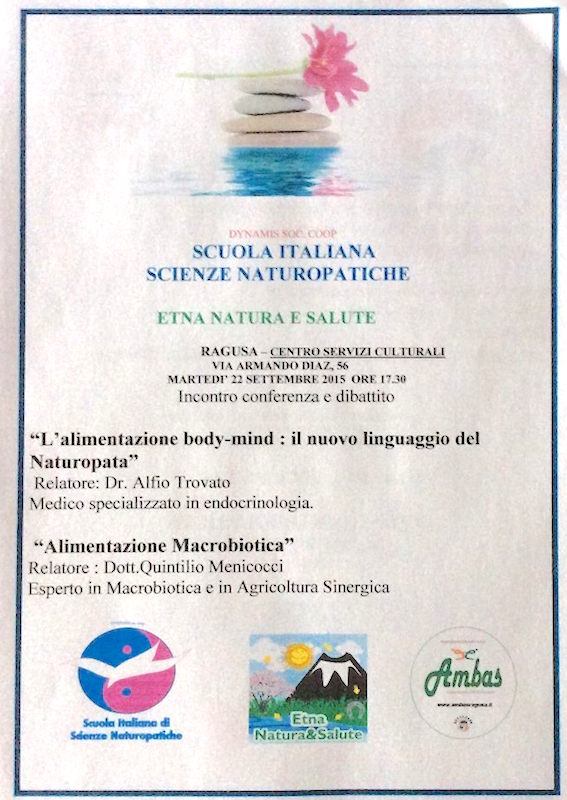 Ragusa, 21 settembre 2015 – Domani 22 settembre, alle 17,30, al Centro Servizi Culturali di via Diaz, si terrà un interessante incontro –conferenza-dibattito organizzato dalla Scuola Italiana Scienze Naturopatiche di Catania.