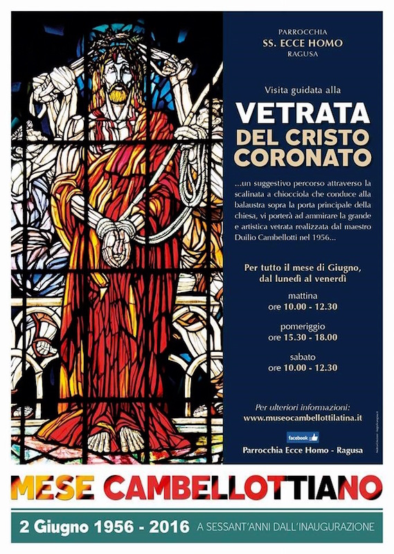 Era il 2 giugno 1956, il primo sabato del mese, quando con grande concorso di popolo furono inaugurate le tre vetrate artistiche riproducenti la Natività e la Pentecoste, nel transetto, e il Cristo Coronato di spine, in alto nella cantoria della Chiesa dell’Ecce Homo in Ragusa.