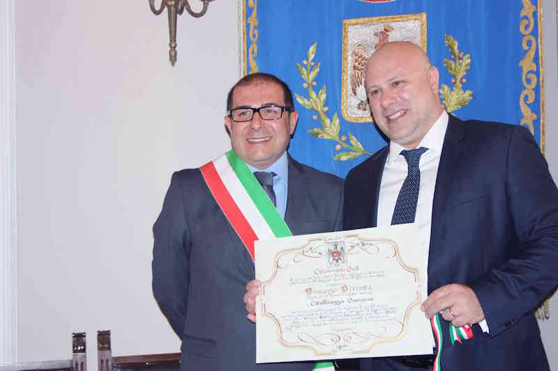 Il Sindaco, Vito Fornaro, alla presenza anche dei genitori di Pirrotta e della affascinante moglie, ha letto le motivazioni che hanno indotto Giunta e Consiglio comunale, a concedere a Vincenzo Pirrotta questo importante riconoscimento: “Per le sue attitudini umane ed artistiche di grande profilo; per aver contribuito in modo decisivo a valorizzare la figura del nostro concittadino, Vincenzo Rabito, autore dell’autobiografia, edita da Einaudi “Terra Matta”, di cui ha curato l’adattamento teatrale e interpretato, in diversi teatri sparsi per il mondo, il ruolo di attore protagonista”.