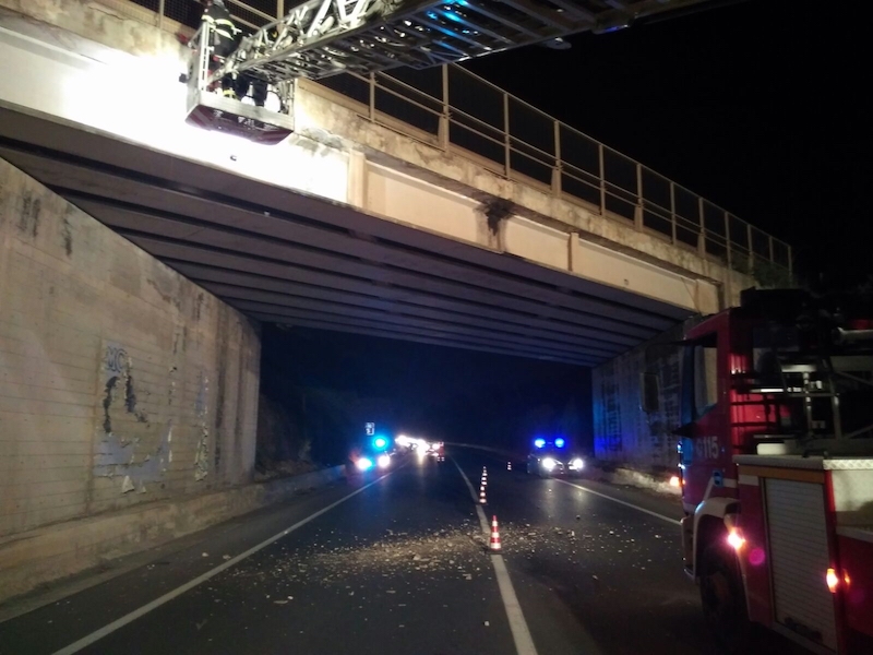 Con l’ausilio dei fari in dotazione, il predetto personale effettuava una verifica del cavalcavia accertando che i calcinacci erano presenti in più punti della strada, motivo per cui comunicava quanto accertato alla Sala Operativa del Comando Polizia Stradale che provvedeva ad inoltrare una richiesta urgente all’Anas di verifica dello stato dei luoghi.