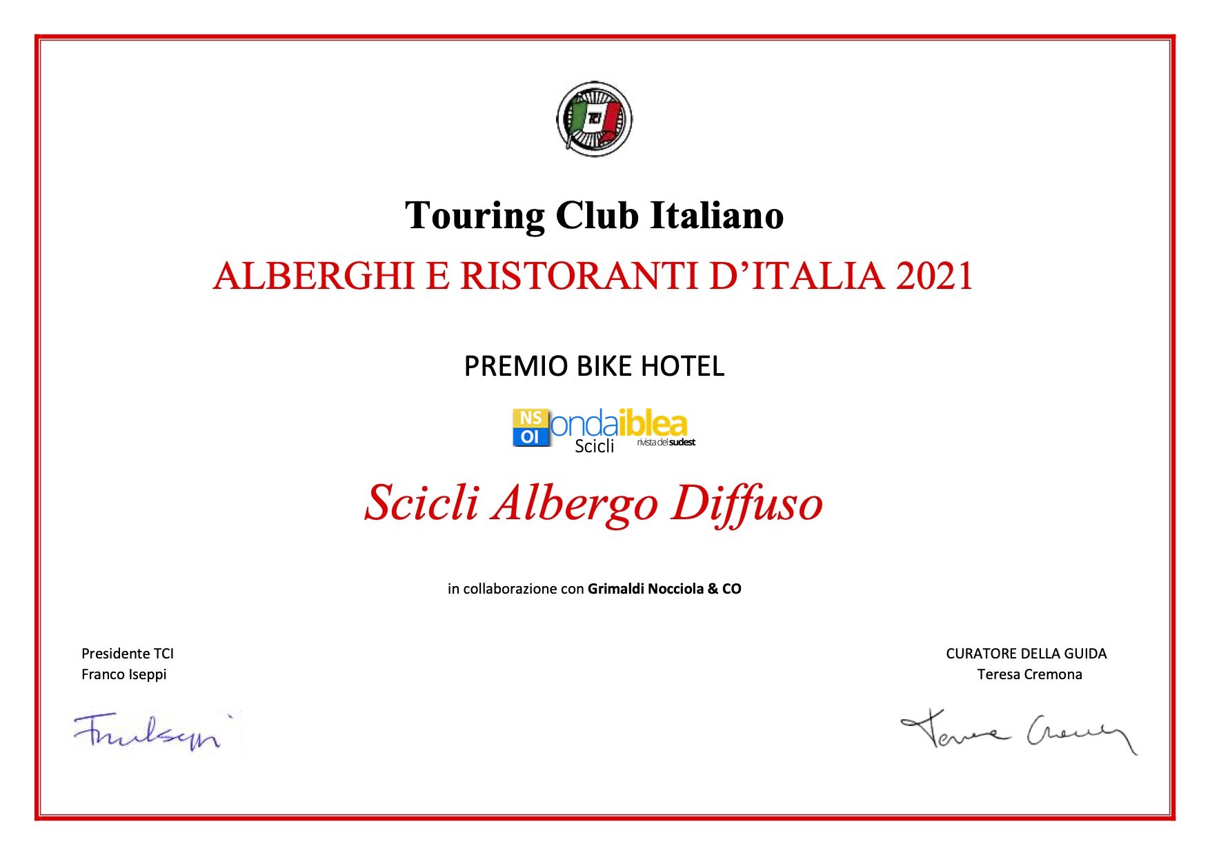 Scicli, 3 dicembre 2020 — Un importante riconoscimento per Scicli Albergo Diffuso da parte di TCI, Touring Club Italiano: la storica associazione non profit, che si occupa dal 1894 di turismo, cultura e ambiente ha infatti insignito la struttura ricettiva sciclitana del Premio Bike Hotel 2021 del quale si potrà fregiare nella guida Alberghi e Ristoranti d’Italia, edita dallo stesso TCI, curata da Teresa e Luigi Cremona, giunta alla sua ventottesima edizione e in uscita il 3 dicembre.