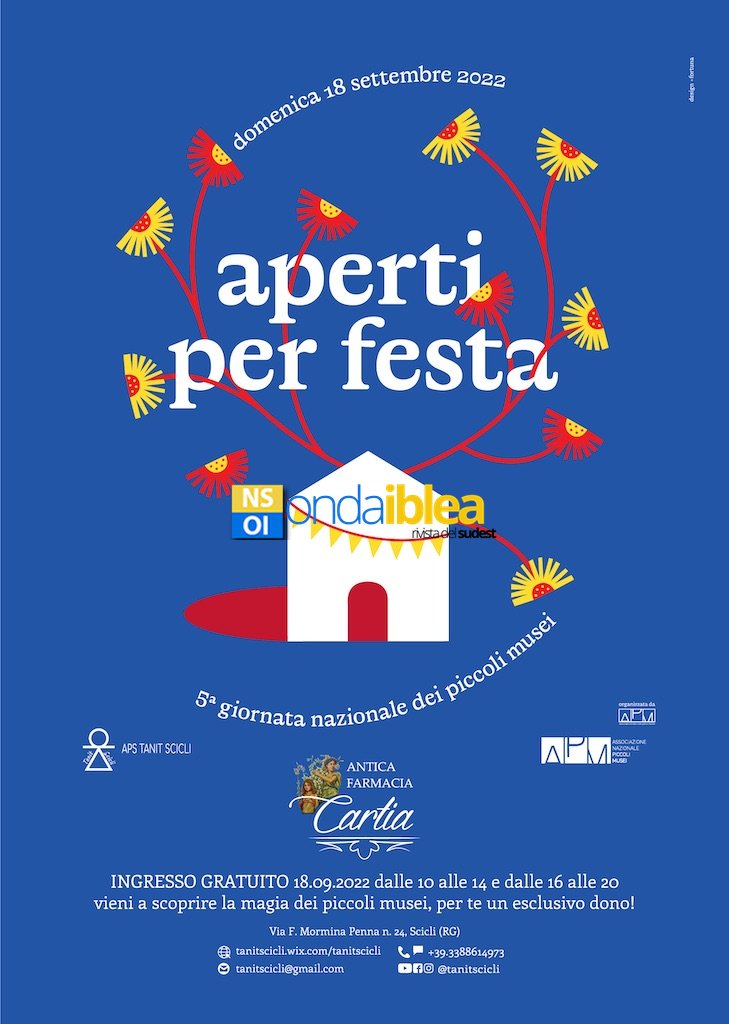 Dopo i festeggiamenti per il 120esimo anniversario dall’apertura della Farmacia dello scorso 11 luglio, domenica Tanit festeggia quindi la Giornata Nazionale dei Piccoli Musei, un open day con ingresso gratuito dove i visitatori potranno ammirare la bellezza dell’Antica Farmacia Cartia, il piccolo museo più a sud d'Italia, ricevendo in cambio anche un piccolo dono, regalato dai componenti dell’associazione per manifestare la propria gratitudine a chi, con la sua visita, omaggia il lavoro e l'impegno quotidiano necessario all'apertura di questo sito culturale tra i più affascinanti e visitati della cittadina iblea.