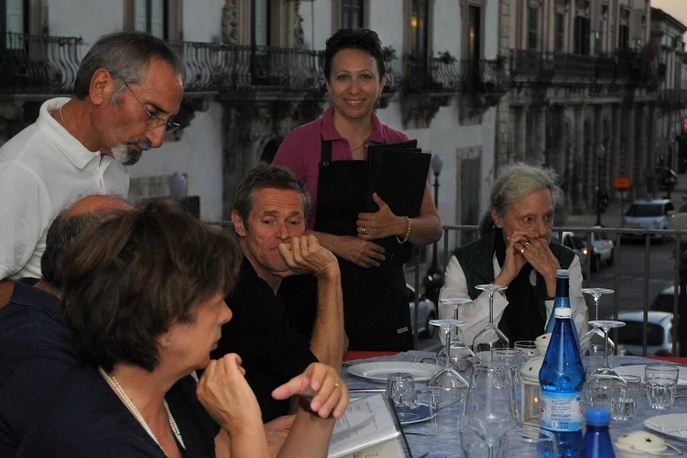 Scicli, 17 agosto 2015 – Lucia e Giovanni, i titolari dell’Osteria, hanno ricevuto Battiato, Dafoe ed i loro amici, con una bella tavolata preparata sull’ormai famoso terrazzino dell’Osteria che offre una impagabile vista panoramica sul centro storico di Scicli, dalla imponente chiesa di San Bartolomeo alla centralissima piazza Italia.