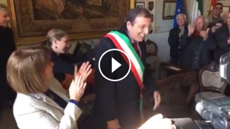 Il neo sindaco era accompagnato dalla moglie Costanza Manenti e circondato da amici, sostenitori politici e dalle due donne designate come assessori.