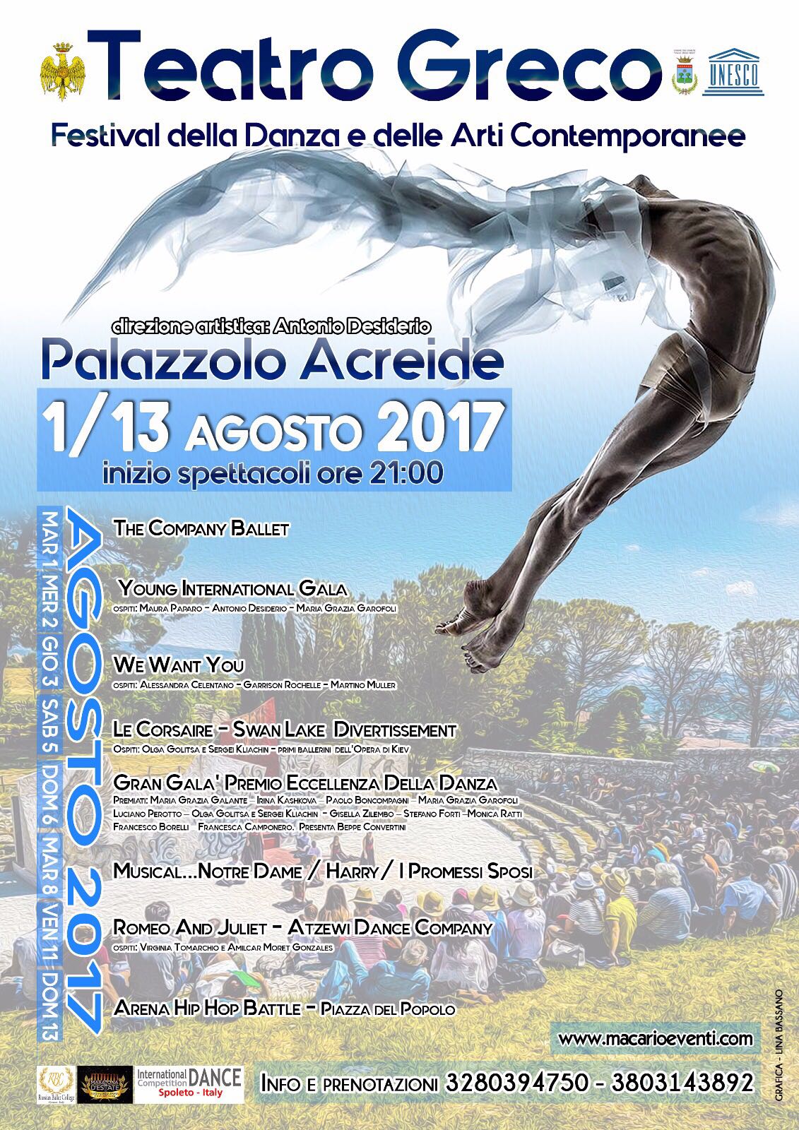“Quest’anno il cartellone di eventi dell’estate palazzolese si arricchisce di un’importante manifestazione dedicata alla danza – ha dichiarato l’assessore comunale al Turismo Luca Russo -. Un evento che riunirà a Palazzolo artisti di fama internazionale. Un’occasione anche per far conoscere il nostro territorio e le sue ricchezze”. Numerosi gli ospiti, nazionali ed internazionali, che si alterneranno nelle varie serate. Ricco il calendario dei diversi eventi: martedì 1 agosto alle 21 al Teatro greco “The company ballet”; mercoledì 2 “Young international gala” sempre alle 21 al teatro, mentre in mattinata ci sarà una lezione aperta nel centro storico con Maura Paparo; giovedì 3 Concorso nazionale “We want you” con la giuria composta da Alessandra Celentano, Garrison Rochelle, Martino Muller; sabato 5 “Le corsaire Jardin Animee”, “Lago dei cigni 3° atto”, coreografie Maria Grazia Garofoli, sempre al Teatro greco alle 21, con la partecipazione straordinaria dei primi ballerini di Kiev, Olga Goltsa e Sergej Kliachin; domenica 6 “Premio alle eccellenze della danza” alle 21 al Teatro greco. Verranno premiati Grazia Galante, étoile internazionale e musa ispiratrice di Maurice Bejart, Irina Kaskova, direttrice Festival di Spoleto e Russian Ballet, Paolo Boncompagni, codirettore Festival di Spoleto, Maria Grazia Garofoli, già direttrice Fondazione Arena di Verona, Luciano Perotto, giovane promessa italo argentina della danza internazionale, Vincenzo Di Primo, ballerino Royal Ballet di Londra, Gisella Zilembo, direttrice del premio MAB (Maria Antonietta Berlusconi), Tomor Kokona, direttore artistico Dance Challenger di Londra, Monica Ratti, direttrice DanzaSi e critico della danza, Francesco Borelli, critico della danza, Francesca Camponero, critico della danza. Martedì 8 “Musical… Notre Dame de Paris - Harry – I promessi sposi, alle 21 al Teatro greco con ospiti del mondo del musical; venerdì 11 “Romeo and Juliet” Atzewi Dance Company e la partecipazione di Virginia Tomarchio e Amilcar Moret, Teatro greco alle 21; domenica 13 “Arena hip hop battle”in piazza del Popolo.