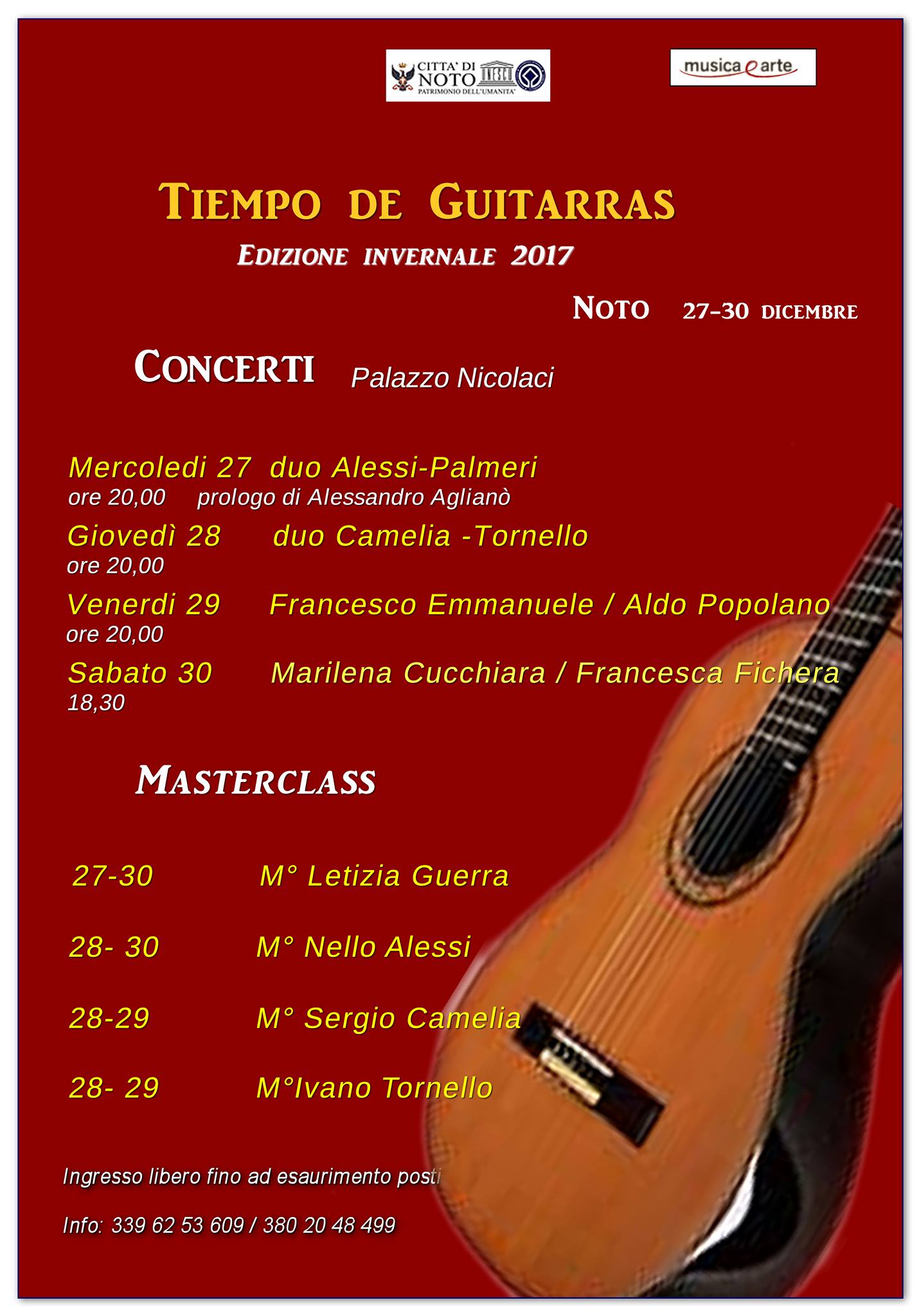 Noto, 23 dicembre 2017 – Quattro concerti per quattro serate di musica. Torna a Noto la rassegna musicale “Tiempo de guitarras” con una speciale edizione invernale che va a chiudere questo 2017.