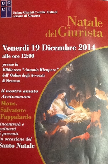 L'arcivescovo di Siracusa, mons. Salvatore Pappalardo, ha accolto anche quest'anno l'invito della sezione siracusana dell'Unione Giuristi Cattolici Italiani e si è recato stamane nella biblioteca "Antonio Ricupero" dell'Ordine degli Avvocati di Siracusa al Palazzo di Giustizia, per celebrare il "Natale del giurista".