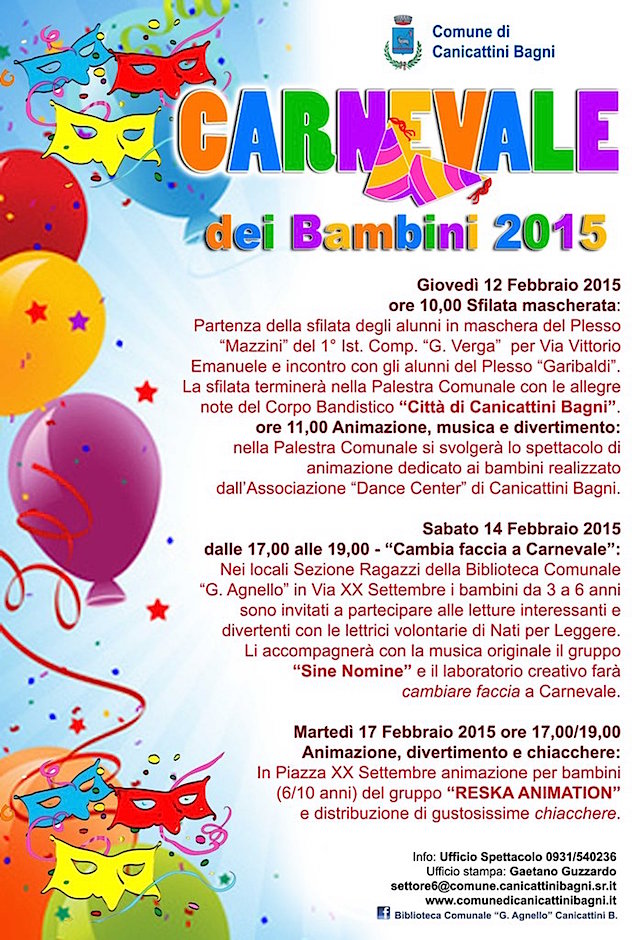 Canicattini Bagni, 6 febbraio 2015 – Al via il programma del Carnevale dei Bambini 2015 varato dall’Amministrazione comunale di Canicattini Bagni tramite l’Ufficio Spettacolo e la Biblioteca Comunale “G. Agnello”.
