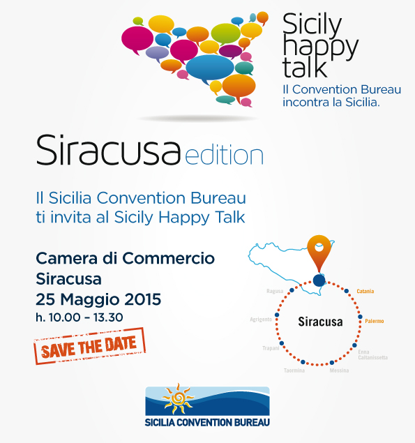Siracusa, 22 maggio 2015 – Si terrà il 25 Maggio 2015, dalle 10.00 alle 13.30, presso la Camera di Commercio di Siracusa la settima tappa del Sicily Happy Talk, l’evento itinerante, organizzato dal Sicilia Convention Bureau e condiviso dalla Regione Sicilia, che in dieci tappe toccherà la Sicilia per favorire l’incontro e il dialogo tra operatori turistici-congressuali e istituzioni locali, dall’entroterra ennese alle Isole Eolie.