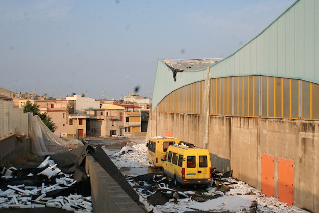 Danni per le due strutture sportive di contrada Masicugno con la copertura del Palasport “G.P. Tricomi” divelta e la struttura tensostatica adiacente, seriamente danneggiata con il telone lacerato in diversi punti. Vigili del Fuoco e personale della Protezione Civile al lavoro per diverse ore per fare proprio la conta dei danni e verificare la stabilità delle strutture danneggiate e mettere in sicurezza le strutture.