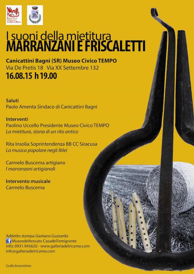 Canicattini Bagni, 13 agosto 2015 – Appuntamento con le tradizioni e la cultura popolare del territorio ibleo, Domenica 16 Agosto 2015 alle ore 19:00 al Museo Civico TEMPO, di via De Pretis 18 - via XX Settembre 132 a Canicattini Bagni con “I suoni della mietitura” - marranzani e friscaletti”.