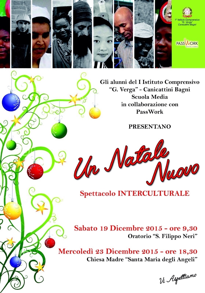 #Canicattini Bagni, 17 dicembre 2015 – La Cooperativa sociale Passwork e la Scuola Media del 1° Istituto Comprensivo "G. Verga" di Canicattini Bagni, presentano Sabato 19 Dicembre 2015 alle ore 9:30 nei locali dell’Oratorio “San Filippo Neri” di via Magenta, e Mercoledì 23 Dicembre alle ore 18:30 nella Chiesa Madre di Piazza XX Settembre, lo spettacolo interculturale “Un Natale Nuovo”.