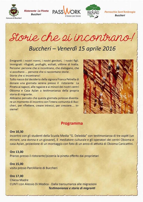 “Storie che si incontrano”, è un progetto voluto da chi ha conosciuto l’emigrazione, ha coltivato la speranza dell’integrazione, ed ha realizzato il suo sogno, la signora Franca Petrella di Buccheri, per anni emigrante all’estero con la propria famiglia per lavoro, ed oggi titolare del ristorante - pizzeria “La Pineta” nel piccolo Comune montano della provincia di Siracusa, e dall’impresa sociale Passwork di Canicattini Bagni, che gestisce i due Centri Sprar “Obioma” per migranti a Canicattini Bagni e a Floridia (il primo per donne e famiglie che necessitano di sostegno, e il secondo per ragazzi), e poi il Centro di Accoglienza per minori stranieri non accompagnati “Casa Aylan”, sempre a Canicattini Bagni.