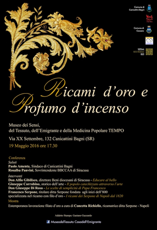 Canicattini Bagni, 16 maggio 2016 – L’antica arte del ricamo con fili d’oro puro, ma soprattutto il restauro dell’importante e vasto patrimonio di ricami, in particolare i paramenti sacri, che il nostro Paese possiede, e quelli sparsi per il mondo, saranno Giovedì 19 Maggio 2016, con inizio alle ore 17:30, al centro di due importanti appuntamenti dal titolo “Ricami d’oro e Profumo d’incenso”, al Museo TEMPO (Musei dei Sensi, del Tessuto, dell’Emigrante e della Medicina Popolare) di via XX Settembre 132 - via De Pretis 18 di Canicattini Bagni.