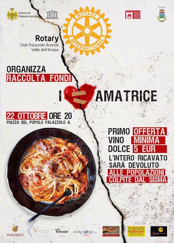 “I love Amatrice” è l’iniziativa promossa del Rotary Club di Palazzolo Acreide “Valle dell’ Anapo”, guidato da Sebastiano Monaco con il patrocinio del Comune di Palazzolo che si svolgerà sabato 22 ottobre alle 20 in piazza del Popolo. L’obiettivo è quello di diffondere, insieme ad un pezzo della storia gastronomica italiana, anche i valori della solidarietà e della condivisione, proprio attraverso il piatto simbolo di questa tragedia, la pasta alla amatriciana.