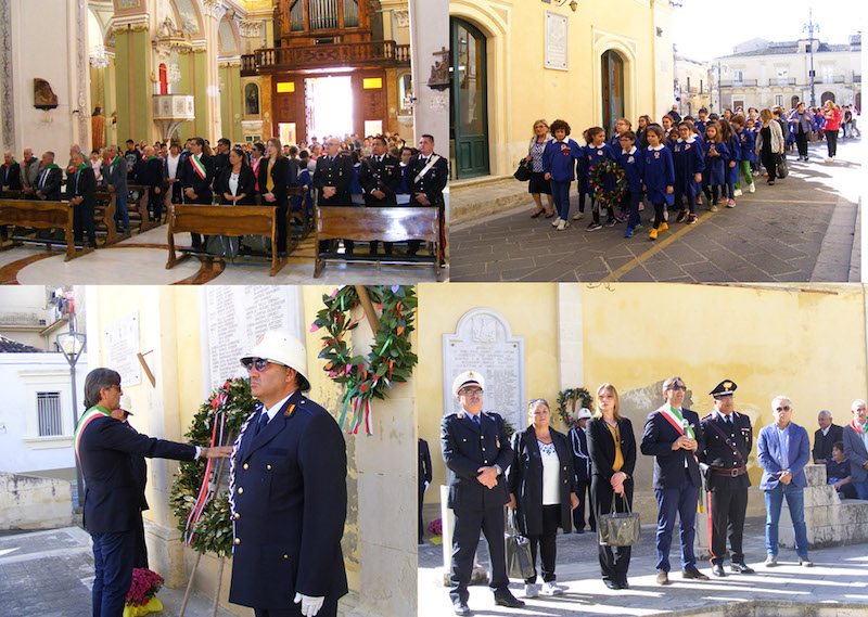 La manifestazione ha visto inoltre la presenza di una numerosa rappresentanza di alunni di ogni ordine e grado nonché Autorità Civili, Militari e Religiose e rappresentanti di Associazioni, ex combattenti e reduci e di volontariato. Due i momenti salienti della cerimonia. Il primo momento in Chiesa Madre con la celebrazione di una Santa Messa officiata dal Parroco della Comunità di Parrocchie Chiesa Madre – SS. Crocifisso, don Bruno Carbone; il secondo momento con la deposizione di corone d’alloro presso la lapide del Milite Ignoto (Palazzo Comunale di via Roma) e presso il Monumento dei Caduti dove ci sono stati anche i discorsi celebrativi.